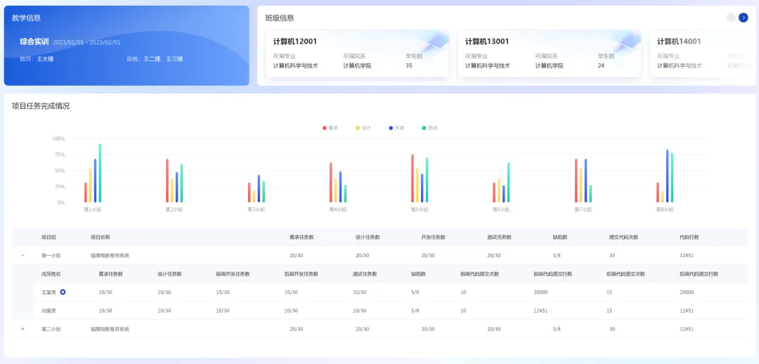 多维度捕捉教学数据,全面覆盖教学周期 可视化教学情况,展示项目组任务和成员贡献,帮助教师和管理者监控教学效果,及时发现问题并采取相应措施;可视化项目进度,展示任务完成情况等,帮助项目成员分析项目的整体进展情况,及时调整工作计划和资源分配,确保项目按时完成。 基于能力图谱的多元学生能力评价 以能力目标为导向,将碎片化的行业项目案例资源进行重构、顺利获得能力目标逐级分解形成清晰的能力点脉络,顺利获得与项目案例任务进行有效关联,从而实现能力图谱建设。顺利获得分析学生在实训过程中的表现、项目完成情况以及代码质量等多维度数据,智能生成每个学生的能力图谱,直观展示学生的能力强弱和提升空间。