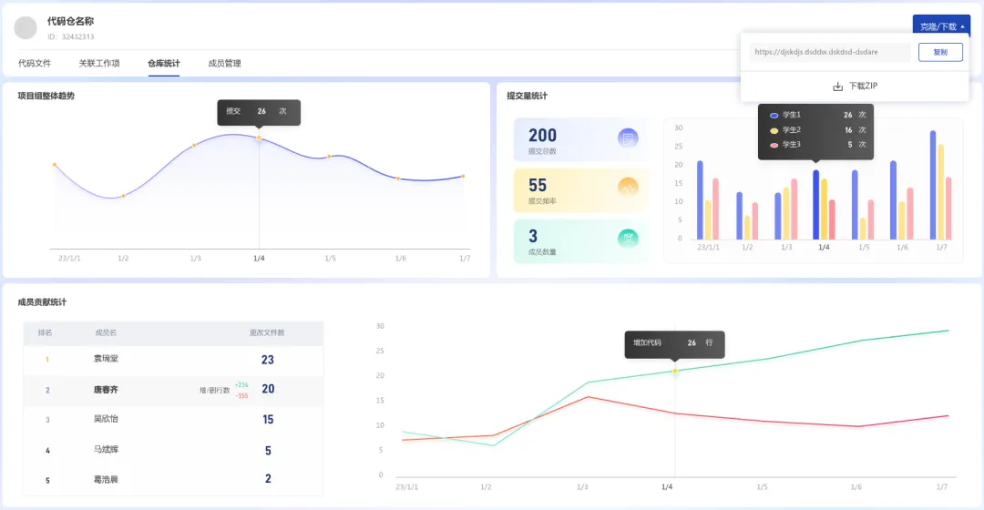 依据教学分组情况,智能为项目组创建代码仓库。支持多人协作开发,团队成员可以共享、代码并行开发。实时记录和跟踪代码仓库的变更情况,实时掌握代码的演进过程。