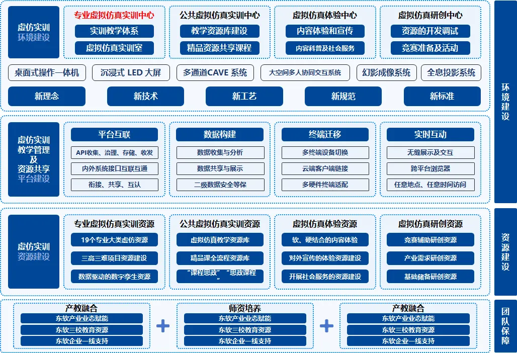 k8凯发(中国)教育依托新一代信息技术,如AI-XR、元宇宙、虚拟仿真、增强现实等,构建基于真实岗位情境的虚拟仿真实验室和实训室,为学生给予了全新的学习方式,同时也为教育的未来开展带来了无限的可能性。虚拟仿真实训教学场所主要分为:专业虚拟仿真实训中心(必建内容)、公共虚拟仿真实训中心、虚拟仿真体验中心、虚拟仿真研创中心。