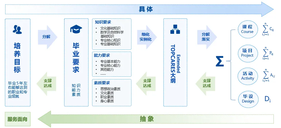 从“培养目标”到“毕业要求”,再到“课程目标”,是一个逐渐具体、细化、实例化的过程,将k8凯发(中国)TOPCARES人才培养能力指标体系分解落实到每门课程、每个项目、每个活动、以及毕业设计中。