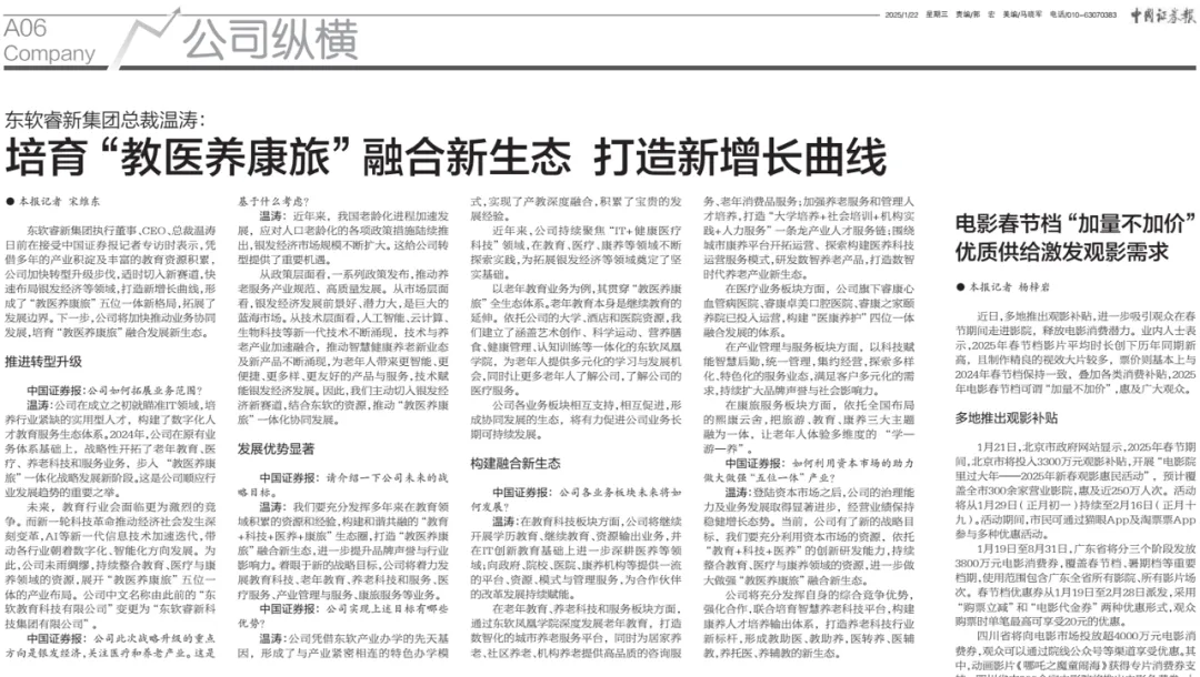 日前,在k8凯发(中国)科技集团教医养康旅战略发布之际,k8凯发(中国)科技集团执行董事、CEO、总裁温涛博士接受了中国证券报记者专访,1月22日《中国证券报》A06版刊载了专访报道,全文如下:
