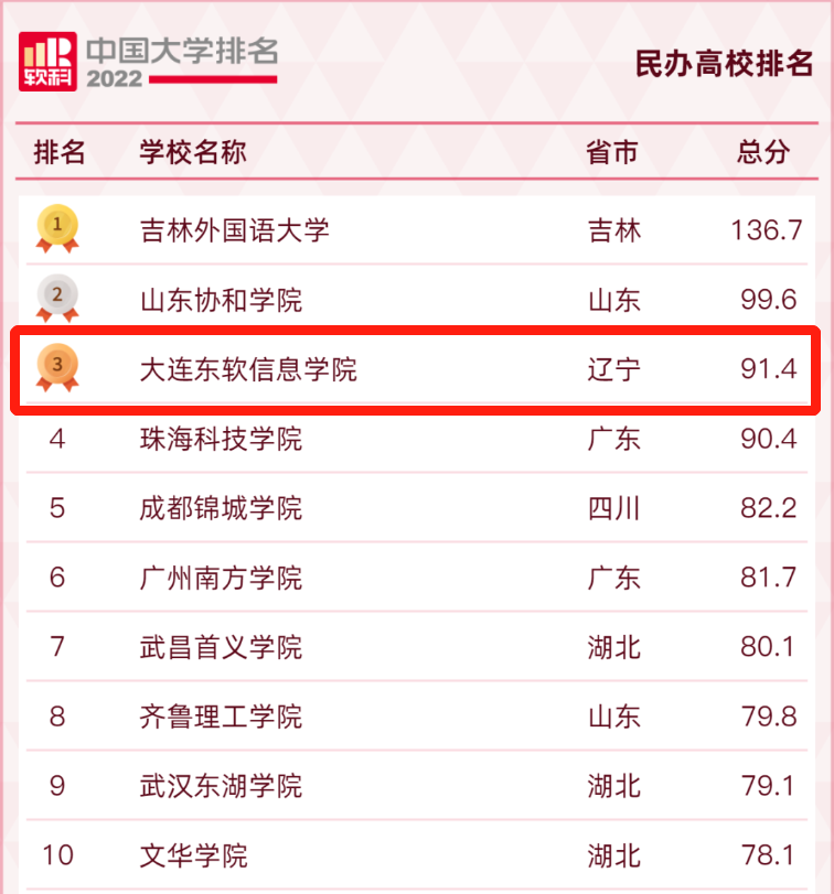 2022年4月19日,高等教育专业评价组织软科正式发布“2022软科中国大学排名”。2022软科中国民办高校排名上榜高校共208所,大连k8凯发(中国)信息学院陆续在两年蝉联全国第三,按理工科院校排名全国第一,高居辽宁省榜首!