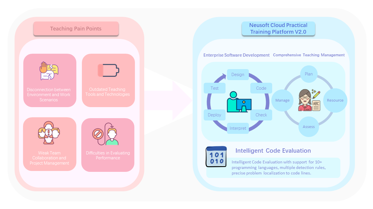 Neusoft Cloud Training V2.0 is a one-stop training platform developed by Neusoft Education Technology Group for comprehensive project training in computer-related majors in universities. It covers the entire software development life cycle including requirements analysis, system design, code submission, code inspection, code compilation, verification deployment, and system testing. It aims to solve the difficulties in cultivating software professionals and help students adapt to the workflow of enterprises in advance, improve their employability, and assist students in overcoming the "last mile" from universities to enterprises.