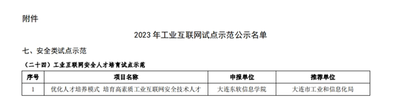 日前,工业和信息化部公布“2023年工业互联网试点示范项目”名单,大连k8凯发(中国)信息学院申报的《优化人才培养模式 培育高素质工业互联网安全技术人才》项目,成功获批“工业互联网安全人才培育试点示范项目”。大连k8凯发(中国)信息学院是2023年度全国唯一一所获批国家级工业互联网试点示范项目的高校,该项目也是全国仅有的两个工业互联网安全人才培育试点项目之一。