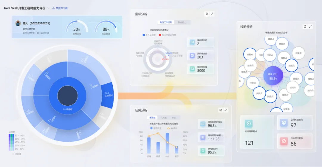 多维度捕捉教学数据,全面覆盖教学周期 可视化教学情况,展示项目组任务和成员贡献,帮助教师和管理者监控教学效果,及时发现问题并采取相应措施;可视化项目进度,展示任务完成情况等,帮助项目成员分析项目的整体进展情况,及时调整工作计划和资源分配,确保项目按时完成。 基于能力图谱的多元学生能力评价 以能力目标为导向,将碎片化的行业项目案例资源进行重构、顺利获得能力目标逐级分解形成清晰的能力点脉络,顺利获得与项目案例任务进行有效关联,从而实现能力图谱建设。顺利获得分析学生在实训过程中的表现、项目完成情况以及代码质量等多维度数据,智能生成每个学生的能力图谱,直观展示学生的能力强弱和提升空间。