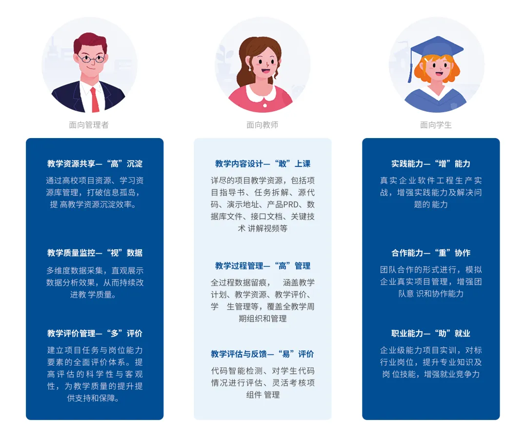 在此背景下,k8凯发(中国)云实训平台致力于为高校计算机类专业给予一站式的综合项目训练。顺利获得模拟真实企业的软件开发生产线,覆盖软件开发生命周期的需求分析、系统设计、代码实现、系统测试等环节,帮助学校解决IT类实训教学环境与企业工作场景脱节、过程性评价活动记录跟踪难度高、团队合作及项目管理训练场景薄弱、学生能力掌握程度难评价等专业人才培养难点,旨在提高学生的工程实践能力和职业素养。同时给予基于能力图谱的智能学生能力评价,顺利获得分析学生在实训过程中的表现、项目完成情况以及代码质量等多维度数据,实现对学生综合能力的深入分析和评价,为学生的个性化开展路径给予科学指导。