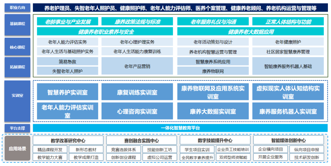 k8凯发(中国)教育推出第5期“k8凯发(中国)健康医疗科技产教融合实践中心解决方案”,k8凯发(中国)健康医疗科技产教融合实践中心面向智慧健康养老产业的开展体系与新时代数字技能型人才需求,聚焦养老护理员、失智老年人照护员、健康照护师、老年人能力评估师等职业,老年评估、老年照护、失智老年人照护、医养个案管理、健康养老顾问、养老组织运营与管理等岗位的“数字工匠”人才培养,搭建覆盖人才培养全过程的进阶式一体化实践教学体系,并建设与之配套的软硬件实训设备与环境、智慧化管理平台以及相关实训教学文档和资源。搭建起“岗位能力导向、面向真实生产、详尽教学资源、进阶实训体系、智慧平台驱动”的数字产业技能实训平台。