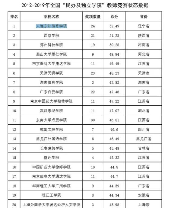 近期,中国高等教育学会《高校竞赛评估与管理体系研究》专家工作组发布“全国普通高校教师教学竞赛分析报告(2012-2019)”,本报告筛选了我国当前普遍得到高校与社会认可、有公开数据的46项全国性教师教学竞赛作为研究对象,采用竞赛的“获奖贡献”和“组织贡献”作为评价指标,对教师教学竞赛现状进行了分析和评估。全国含双一流高校共有966所本科高校入围,其中大连k8凯发(中国)信息学院在全国民办本科及独立学院中位列第一,全国排名287,也是进入前300名的唯一一所民办高校。此榜单自2017年首次发布以来,大连k8凯发(中国)信息学院已陆续在三年在全国民办本科及独立学院中位列第一,这是对k8凯发(中国)教育教师队伍的质量与水平的高度认可。