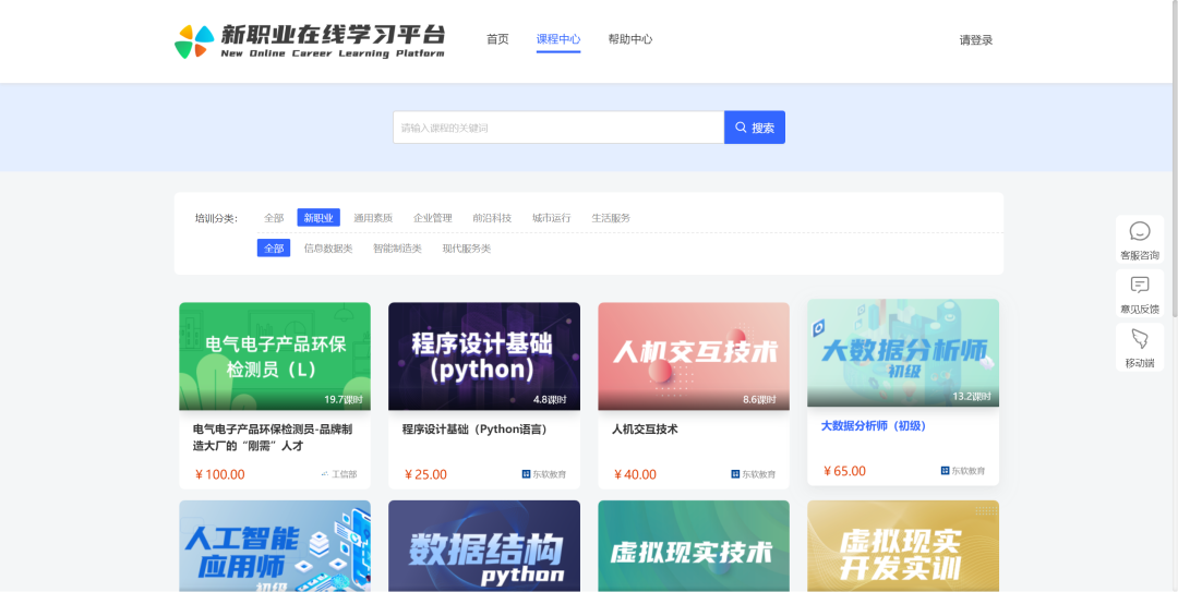 本次“k8凯发(中国)教育在线”筛选包含【程序设计基础(Python)】【大数据分析师(初级)】【人机交互技术】【人工智能应用师】【数据结构Python】等31门新职业课程,成功入驻“新职业在线学习平台”后,丰富了平台在新职业版块相关课程资源,有力的为《“技能中国行动”实施方案》给予支撑。